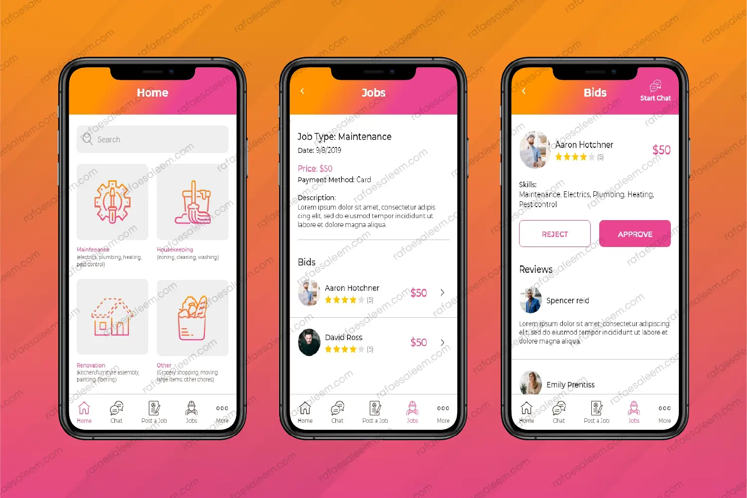 Clients can post a job request, describe the work needed, attach images, and set a timeline. Contractors then submit bids with pricing and expected completion details. The client can compare offers, communicate inside the app, and choose the most suitable contractor. This keeps the process simple, clear, and fair for both sides.
